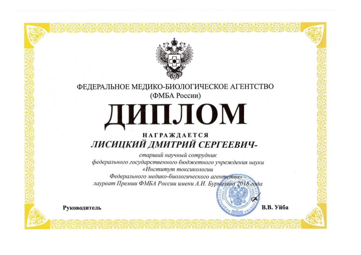 На заседании состоялось вручение государственных наград Российской Федерации, ведомственных знаков отличия ФМБА России, награждение лауреатов премии имени А.И. Бурназяна. Премией ФМБА России имени А.И. Бурназяна 2018 года по направлению «Образование» награжден старший научный сотрудник ФГБУН ИТ ФМБА России Лисицкий Дмитрий Сергеевич. Награду вручил лично Руководитель ФМБА России Заслуженный врач Российской Федерации, Заслуженный деятель науки Российской Федерации, Заслуженный врач Чеченской Республики, доктор медицинских наук, профессор Уйба Владимир Викторович.